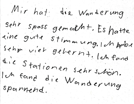 «Mir hat die Wanderung sehr Spass gemacht. Es hatte eine gute Stimmung. Ich habe sehr viel gelernt. Ich fand die Stationen sehr schön. Ich fand die Wanderung spannend.»