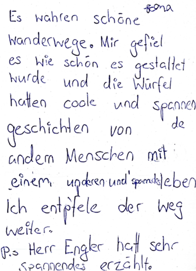 «Es waren schöne Wanderwege. Mir gefiel es wie schön es gestaltet wurde und die Würfel hatten coole und spannende Geschichten von den anderen Menschen mit spannenden Leben. Ich empfehle den Weg weiter.»
