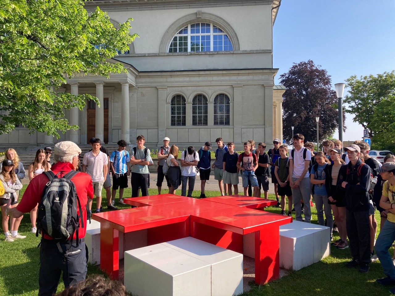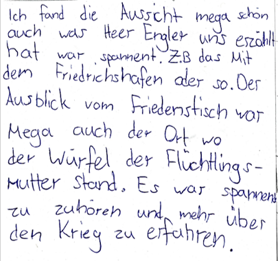 «Ich fand die Aussicht megaschön, auch was Herr Engler uns erzählt hat, war spannend. zB das mit Friedrichshafen oder so. Der Ausblick vom Friedenstisch war mega, auch der Ort wo der Würfel der Flüchtlingsmutter stand. Es war spannend zu hören und mehr über den Krieg zu erfahren.»