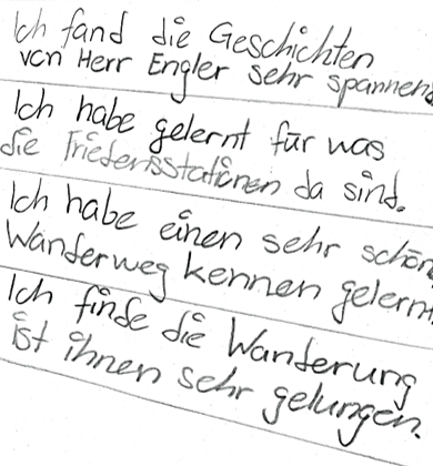«Ich fand die Geschichten von Herr Engler sehr spannend. Ich habe gelernt, für was die Friedens-Stationen da sind. Ich habe einen sehr schönen Wanderweg kennengelernt. Ich finde die Wanderung ist Ihnen sehr gelungen.»