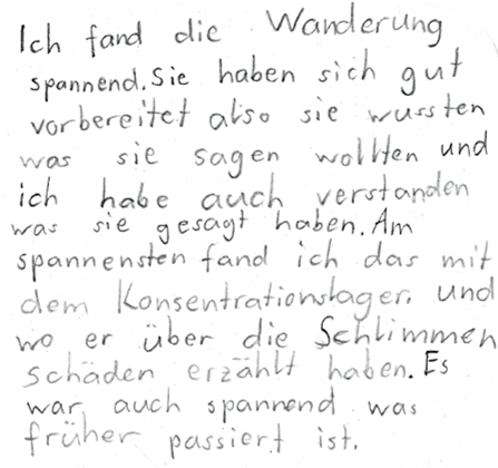 «Ich fand die Wanderung spannend. Sie haben sich gut vorbereitet, also sie wussten was sie sagen wollten und ich habe auch verstanden was sie gesagt haben. Am spannendsten fand ich das mit dem Konzentrationslager. Und wo er über die schlimmen Schäden erzählt hat. Es war auch spannend was früher passiert ist.»