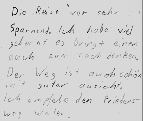 «Die Reise war sehr spannend. Ich habe viel gelernt, es bringt einem auch zum nachdenken. Der Weg ist auch schön mit guter Aussicht. Ich empfehle den Friedensweg weiter.»