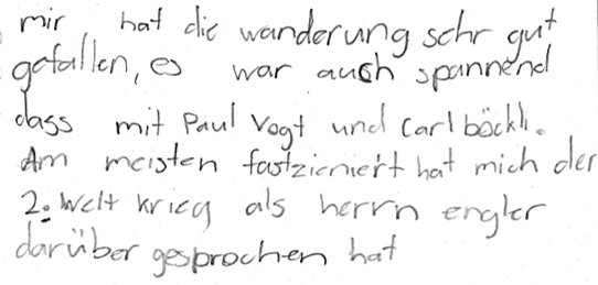 «Mir hat die Wanderung sehr gut gefallen, es war auch spannend, das mit Paul Vogt und Carl Böckli. Am meisten fasziniert hat mich der 2. Weltkrieg als Herr Engler darüber gesprochen hat.»